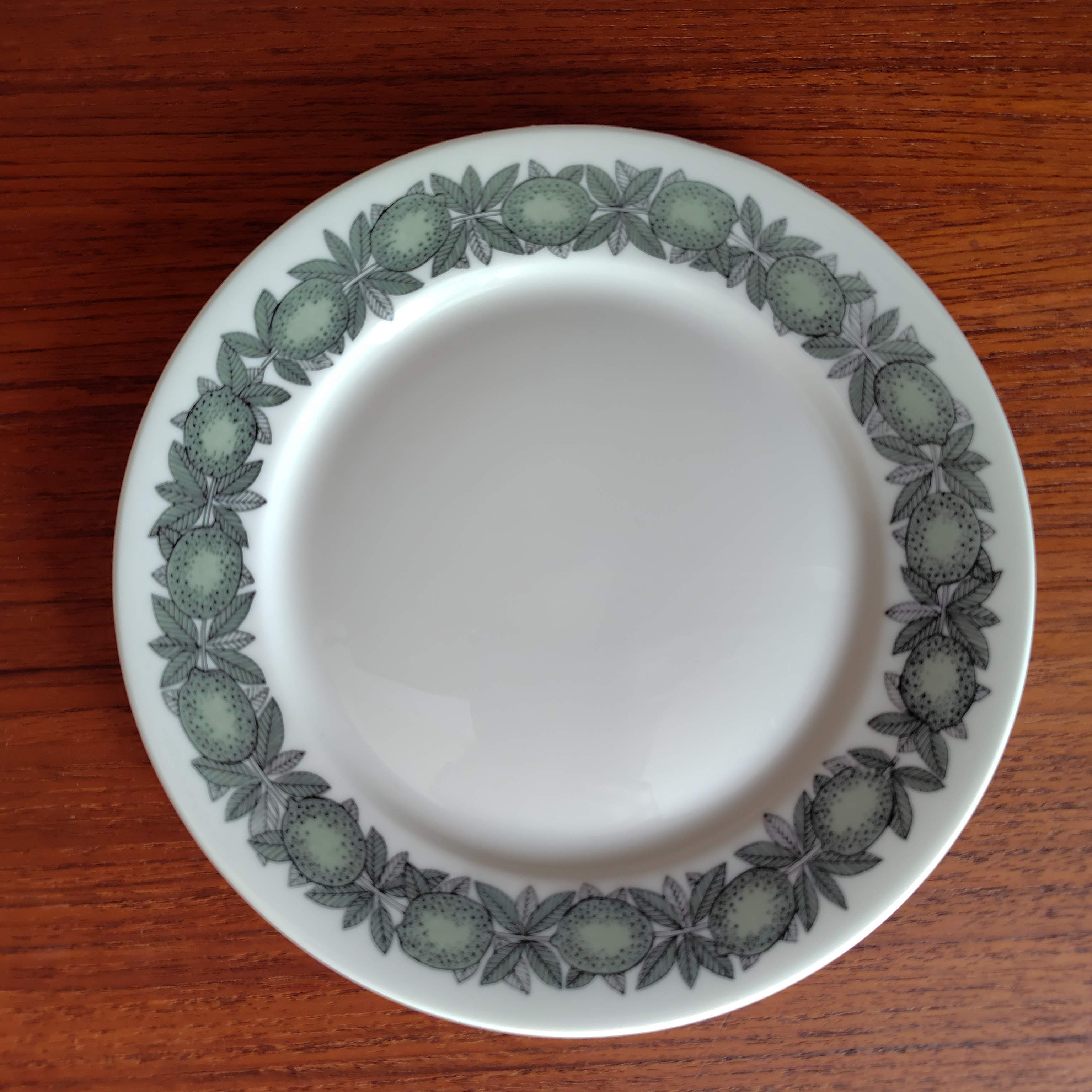 グレイッシュなオリーブグリーン色で、レモンと葉がシックに描かれたデザートプレートです。使用感、ヒビや欠けなく、艶もある非常に良いコンディションの品です。 size : 直径17cm x H 1.7 cm production : Finland 1964-71 designer : Richard Lindh(フォルム)