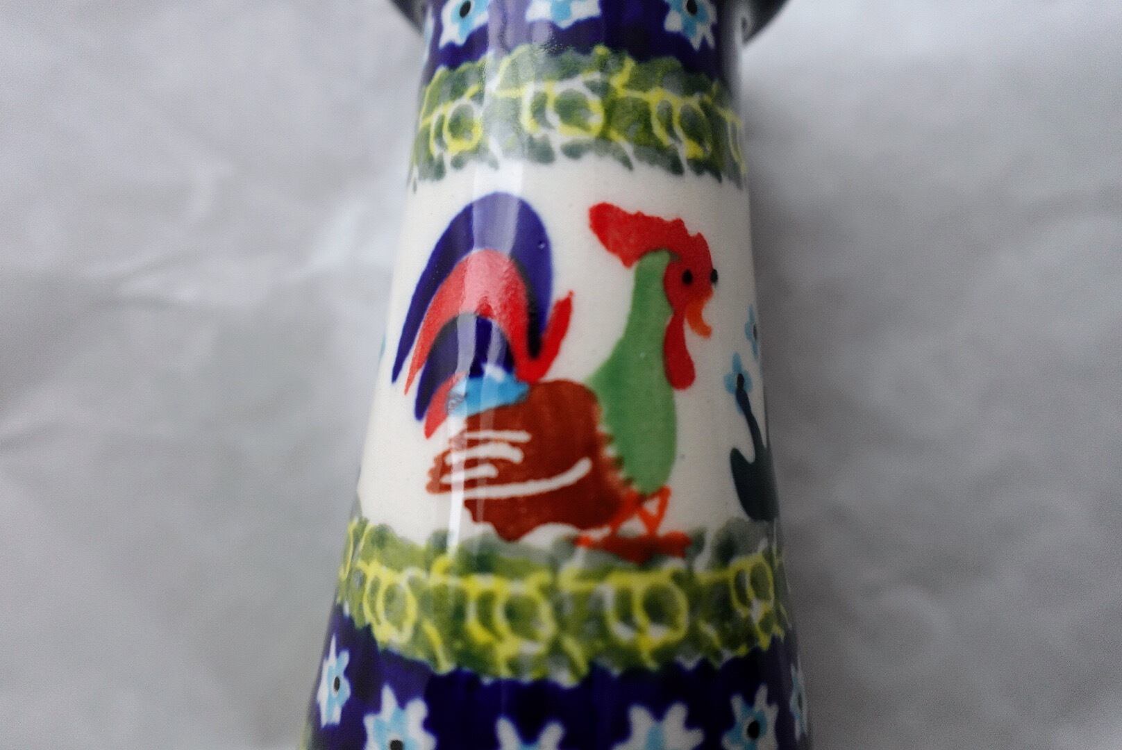 カラフルな雄鶏が庭を駆けているような絵本の世界をイメージさせる微笑ましいデザイン。上口のすぼまった一輪挿しでも飾れる安定感のあるフォルムです。 size : 口径4.8 底7、 H 13.8cm